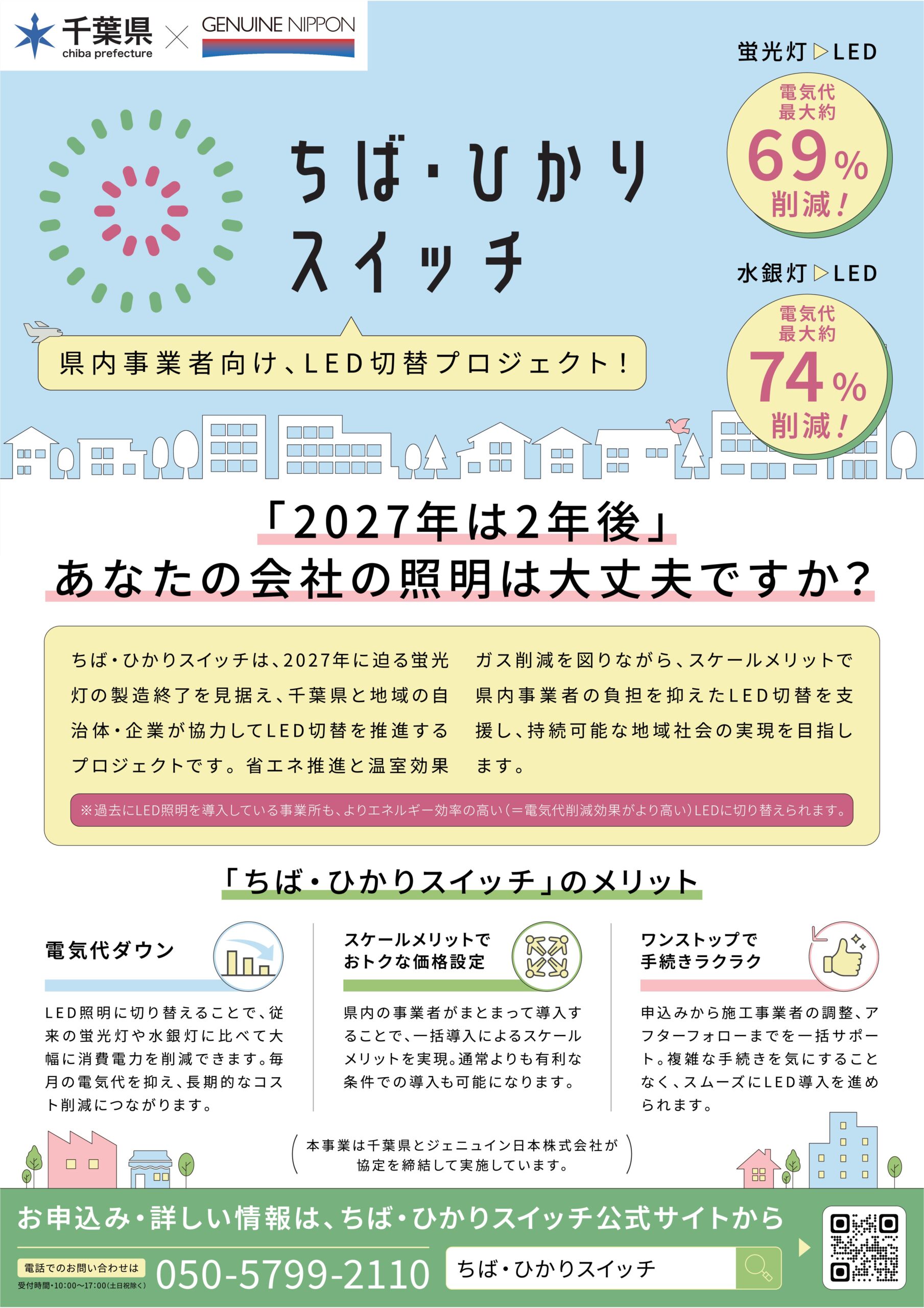 『ちば・ひかりスイッチ』は、千葉県とジェニュイン日本株式会社の協定により実施される公式支援事業です。
